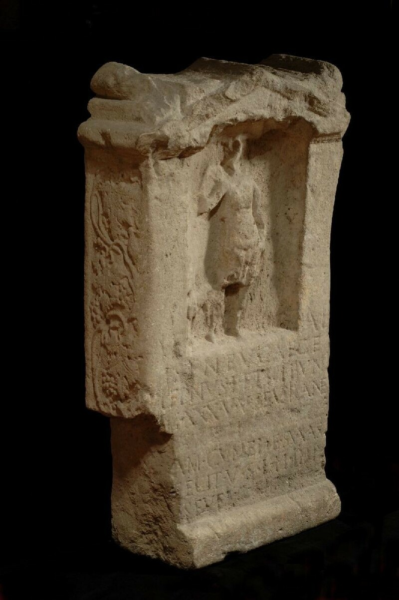Romeinse wijsteen, kalksteen, zeer sterk afgesleten, op de zijkanten is nog een mooi blader- en rankenornament zichtbaar; aan de voorzijde in de nis de godin Iseneucaega met hond, die naar haar opkijkt. Daaronder een inscriptie. Damnatio memoriae van keizer Severus Alexander in 235 na Chr.