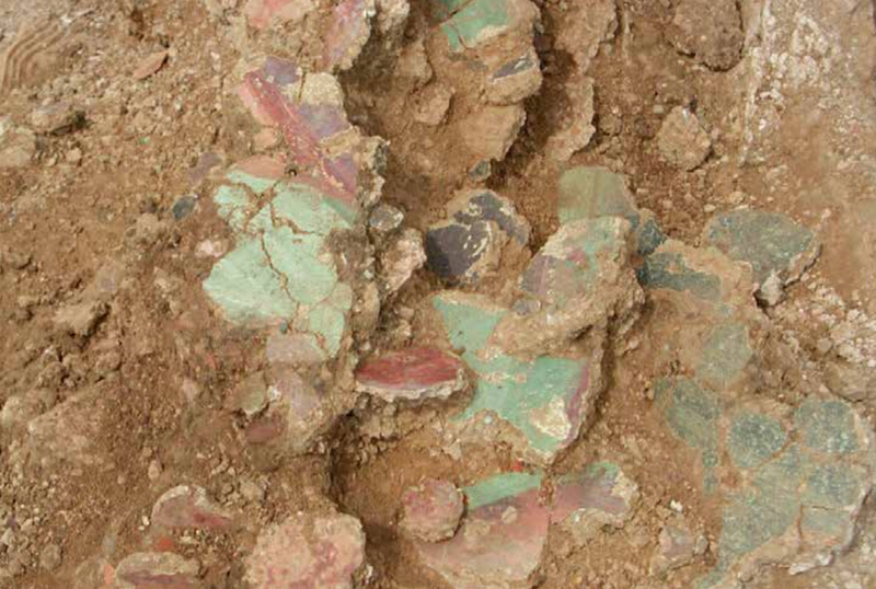 Beschilderd pleisterwerk zoals het werd aangetroffen in de kuip van het koudwaterbad. De foto is genomen nadat de schilderingen voorzichtig waren schoongespoeld met behulp van een spuitbus met gedestilleerd water.