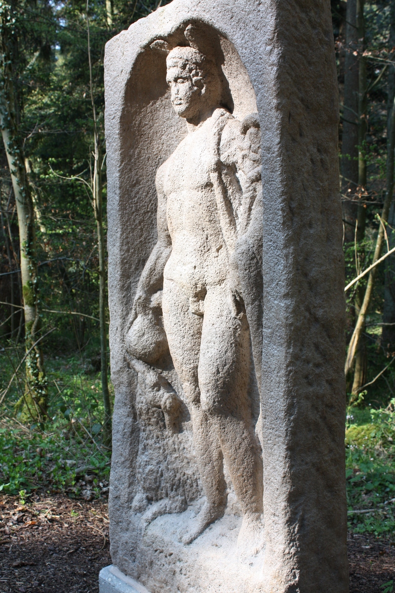 Merkurrelief im Rotenbachtal (Schwäbisch Gmünd), datiert auf 2./3. Jh. n. Chr., Kopie eines Originals aus dem Landesmuseum Württemberg. Fundort des Originals Rottenburg am Neckar. Das Relief wurde 1843 beim Bau des Kreisgefängnisses Rottenburg gefunden und gehörte ursprünglich wahrscheinlich zur Ausstattung eines Heiligtums.