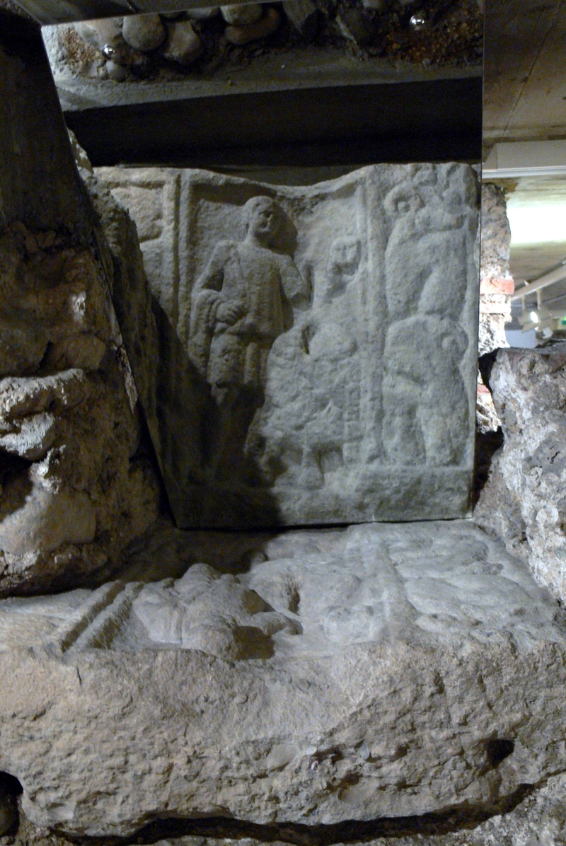 Lorch ( Enns/Oberösterreich ). St.Laurenz-Basilika: Ausgrabungen eines römischen Hauses ( 2.Jhdt. ) - Relief mit Opferszene, als Spolie in den Fundamenten der frühchristlichen Kirche verbaut.