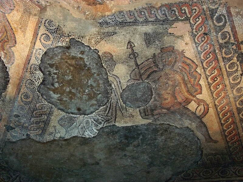 Chedworth Roman Villa -- Panel 2 of the Satyrs and Maenads mosaic in the Triclinium.
