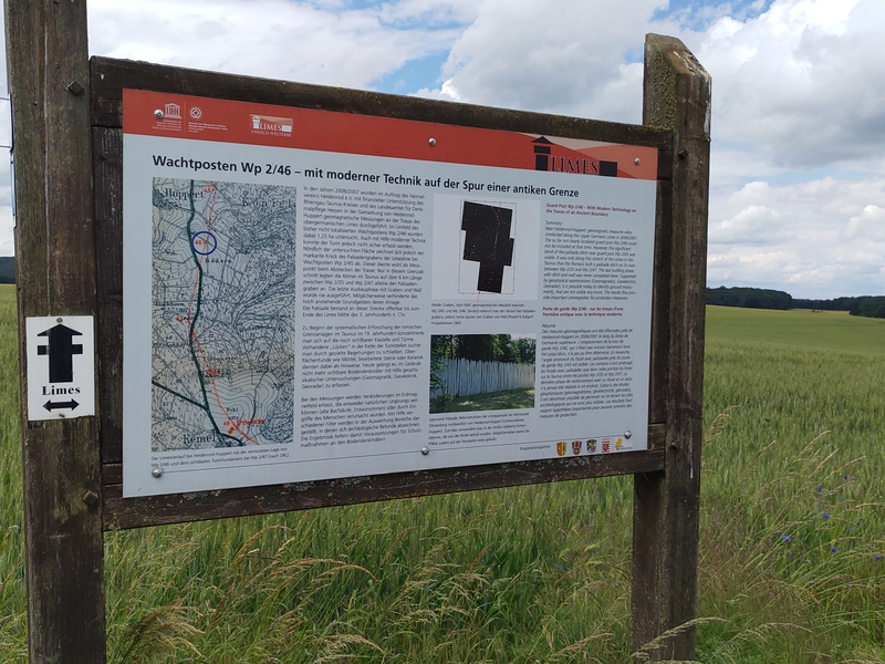 The explanatory sign at tower 2-46, detailing the geophysical research that revealed the traces of a palissade at the spot