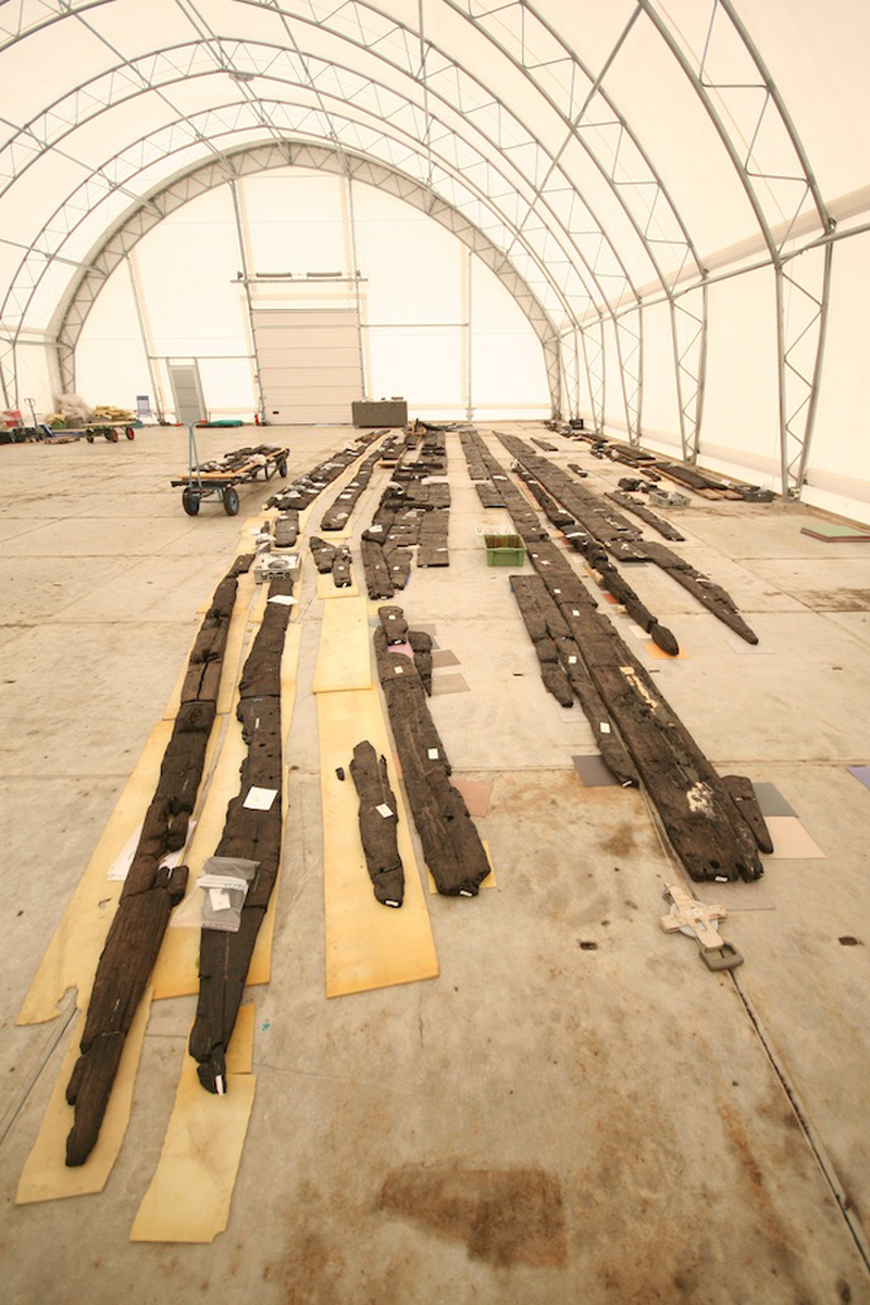 De houtresten van het Romeinse schip "Zwammerdam 2" uitgelegd de RCE vestiging Lelystad ten behoeve van het onderzoek van Yardeni Vorst (februari 2013).