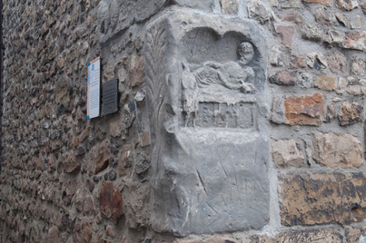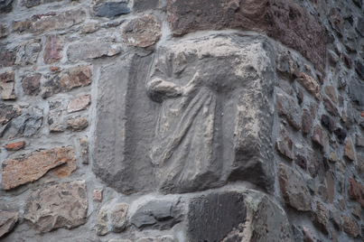 In de noordeljke toren is een steen te zien die een man in toga verbeeld.