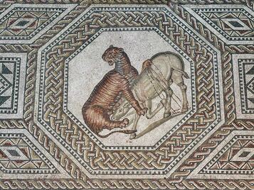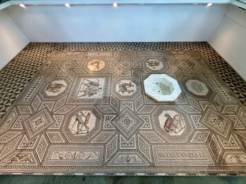 Um ein Wasserbecken sind sechs Achtecke und ein Rechteck dargestellt, welche Szenen aus der römischen Kampfarena darstellen. Es gibt bis heute noch keine belegten Angaben über den Baubeginn der Prachtvilla. Aufgefundene Münzen, die Beschaffenheit des Mauerwerks, des Wandputzes und des Fußbodens selbst lassen aber auf eine frühe Zeit des römischen Imperiums schließen. Die Villa – oder auch ein anderes Gebäude – standen hier aber zu einer früheren Zeit, denn bei Ausgrabungen fand man auch Teile eines Vorläuferbauwerks. Topfscherben beweisen, dass hier wohl schon vor Christi Geburt Menschen lebten.1