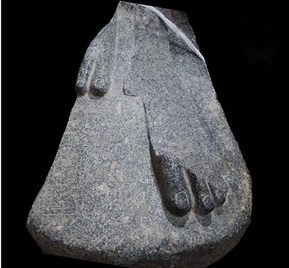 The granite fragment of a statue base of King Amenhotep III (r. 1391–1353 or 1388–1351 BC). Unearthed fragment diplays the left foot and part of the right. The inscription contains hieroglyphic symbols of both the birth name and coronation of King Amenhotep III.