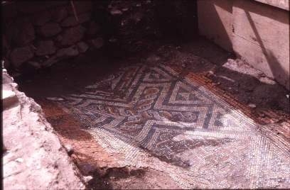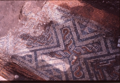 Roman mosaic under St Catherine's, Exeter During the excavation of the ruins of St Catherine's Chapel and Almshouses in Exeter, this small part of Roman mosaic floor was exposed. It is no longer visible1.