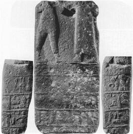 The Kellekli Stela was found in 1902 ca 1 km from the village Kelekli. The 1.2 meter highand 0,62 m wide, with a missing top and bottom was made of black basalt stone. Two opposing figures, possibly Teshub (dressed in short kilt and shoes with upturned toes) 1 and a ruler are depicted on the front side. Below them on left, front, and right sides is a luwian inscription of Suhis II of Karkamış. The name of a king Tudhaliyas is recorded as well.Stele dates to Karkemis II / III Period.