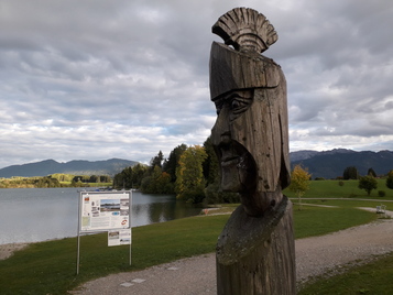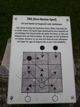 Neben der Infotafel ist die Stelle touristisch aufgearbeitet mit Holzrömern und Steinmetzarbeiten. Nett ist die Idee, römische Spiele zum ausprobieren zur verfügung zu stellen.
