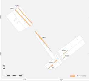 De aanwezigheid van 2 evenwijdig lopende greppels uit de Romeinse tijd, opgevuld met aardewerk uit de 2-3de eeuw na Chr.